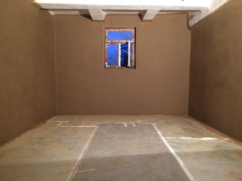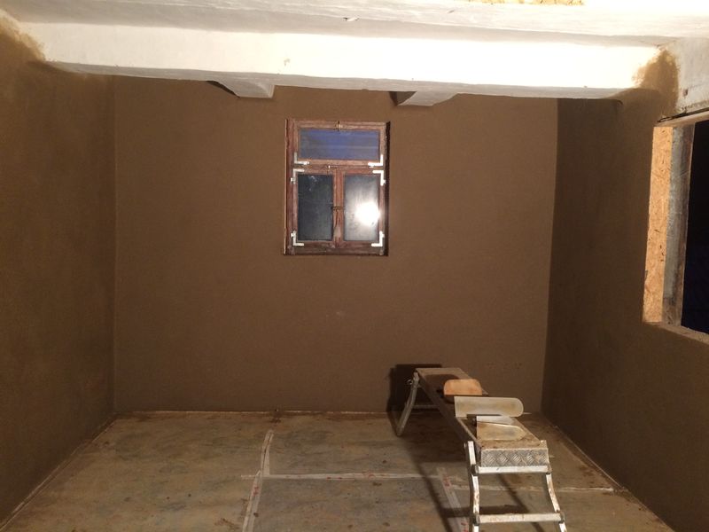 Während der Lehmbauer weiter den Putz an den Wänden aufträgt, versuche ich hinter ihm her die Balkenanschlüsse nachzumodellieren und die Übergänge zum Altputz zu reiben. Das lief besser als ich dachte! Mal schauen, ob sich die Rissbildung in Grenzen hält.