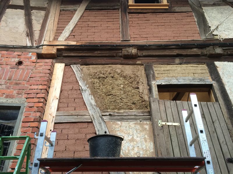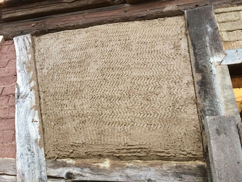 Zum Beispiel gibt es neben der Haustür noch ein Gefach, was mächtig rausgebröselt ist. Und damit im Winter durch das Wetter nicht noch mehr rausbröselt und die Wand immer mehr Schaden nimmt, habe ich dort das Gefach ausgebessert.