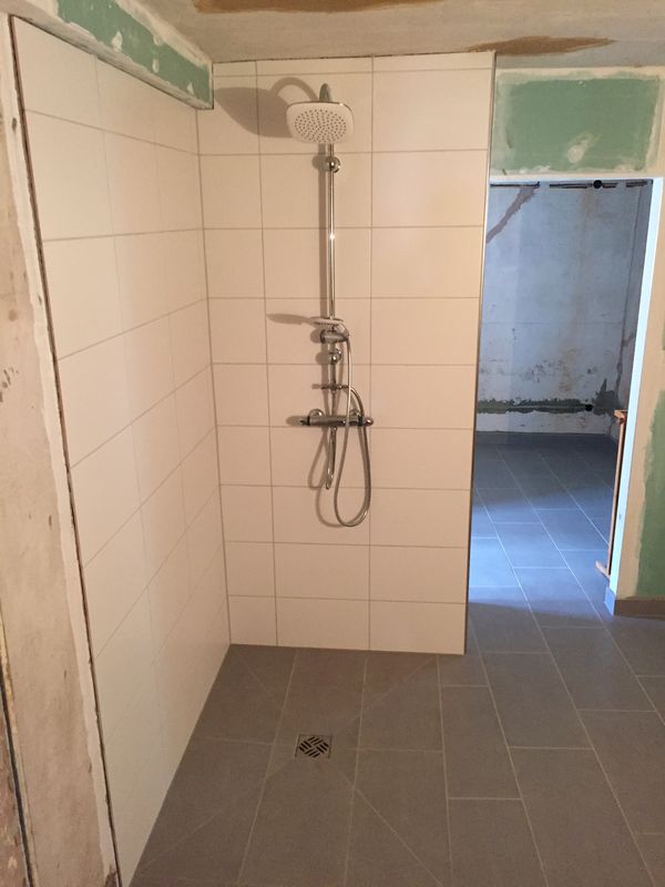 Zwar fehlt noch die Duschabtrennung, aber wenn man sich ganz nah an die Wand stellt...!