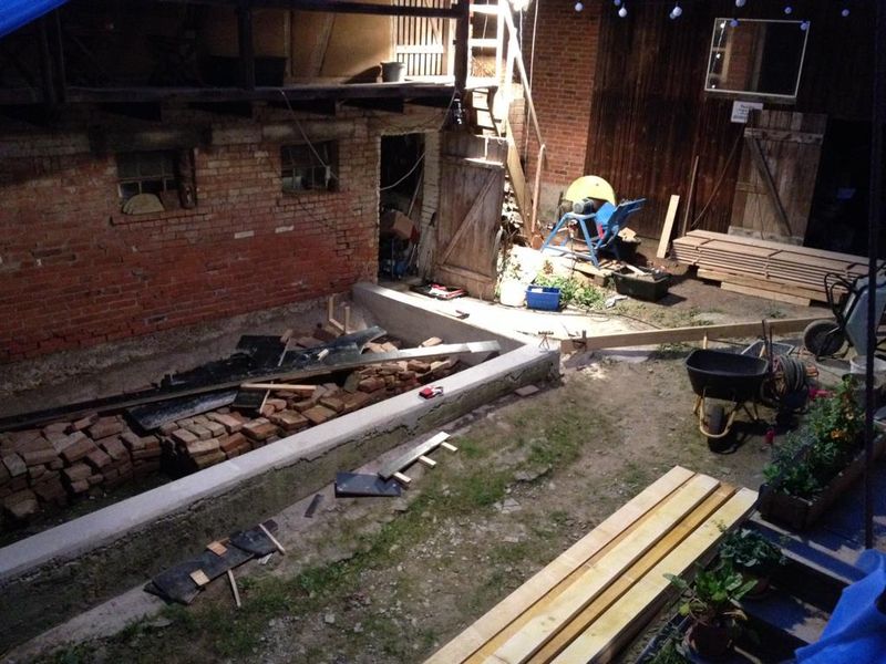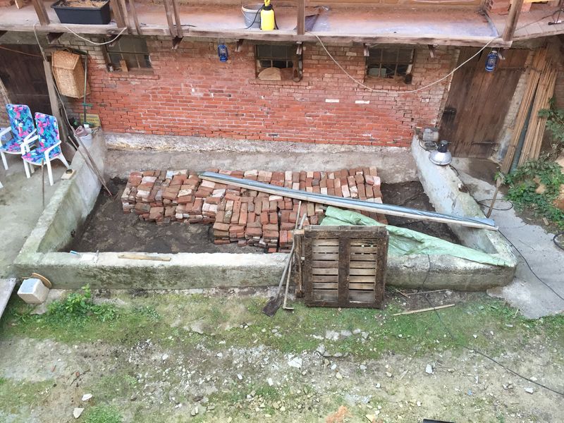 Wir haben sie erst einmal von dem ganzen Baumüll befreit und die Ziegel dort eingelagert. Der Plan ist, die Beplankung abnehmbar zu gestalten, so dass man später den Platz unter der Miste nicht verschenkt hat und ihn zu Lagerzwecken nutzen kann (oder sogar auch wieder als Miste?!).