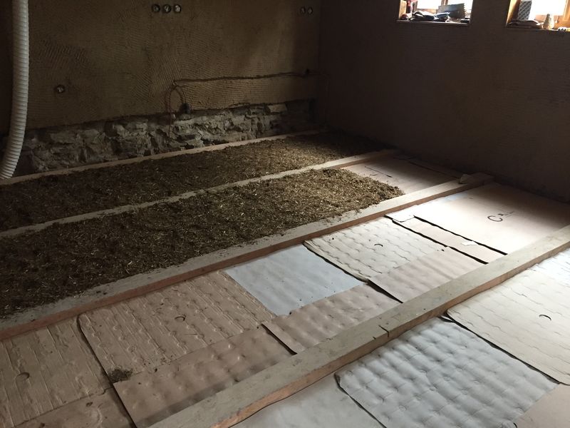 Auf dem Fehlboden wurden Pappen als Rieselschutz ausgebracht und dann der fertig gemischte erdfeuchte Strohlehm Eimer für Eimer zwischen die Balken bis Oberkante geschüttet. Die Pappen haben wir aus dem Getränkemarkt geholt (liegen immer zwischen den 6er Pack Getränke Trägern) Das kostet nichts und hilft die Geldbörse und die Umwelt zu schonen ;-)