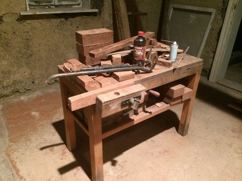 Eine alte Kinderwerkbank, beschwert mit Ziegelsteinen, diente uns als Zuschneidetisch.