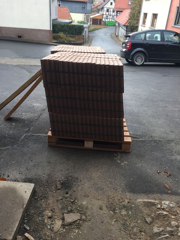 Aber nicht schön, der schiefe Turm von Pisa!! Es wird ja nur zum Bordstein geliefert und wir müssen das Material wenigstens unter das Tor bekommen, ohne viel Bruch zu machen...