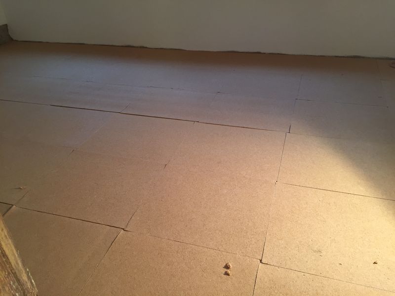 Den Anfang macht die Holzfaserplatte. Sie dient dazu, kleine Unebenheiten auszugleichen und den Schallschutz/ die Dämmung zu verbessern.