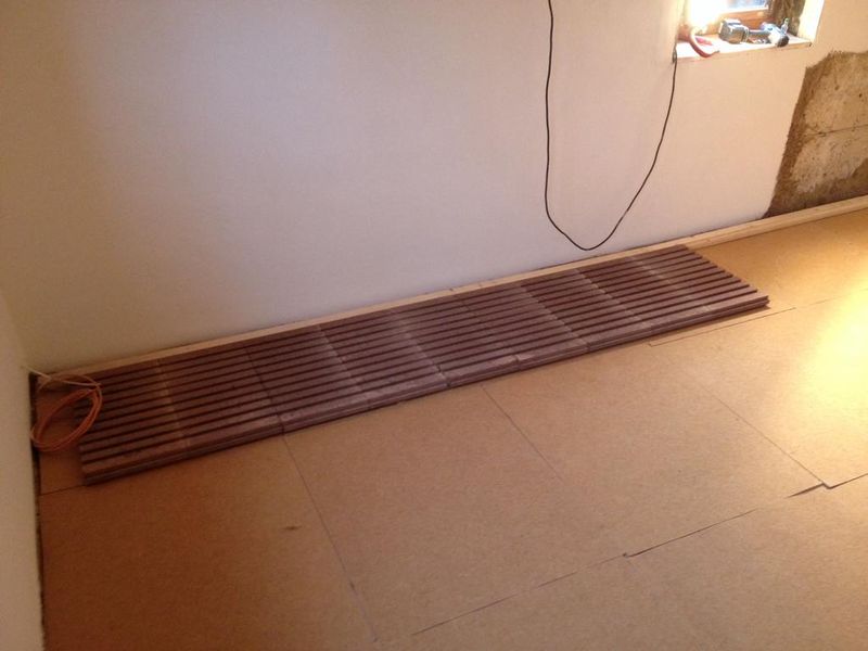 Beginnend mit einer Holzleiste und dann im Wechsel mit den Tonplatten, alles im Klicksystem Die Holzleisten dienen als Lager zur Befestigung der Dielen.