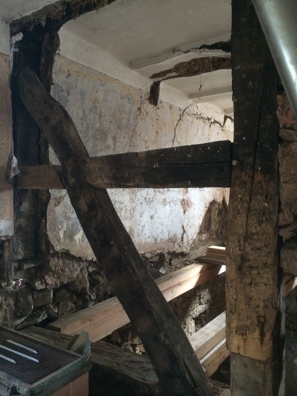Dort hat es früher wohl mal gebrannt und es wurde notdürftig geflickt. Die Strebe hing nur noch in der Luft und wurde von Lattenwerk gehalten. So konnte das nun wirklich nicht bleiben und ich dachte wieder an Recycling.