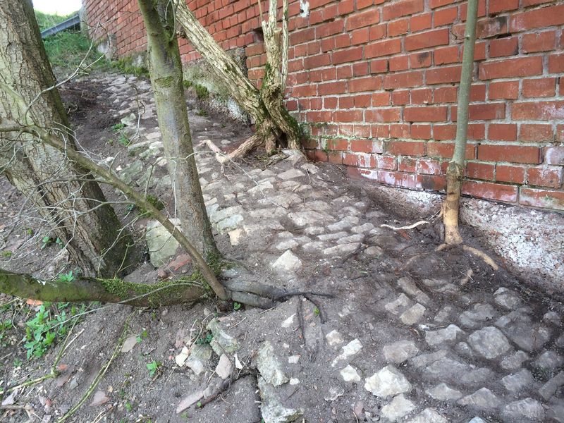 Dabei sind wir auf den alten gepflasterten Gartenweg entlang der Scheune gestoßen. Eine dicke Humusschicht hatte ihn im Lauf der Jahre unter sich begraben.