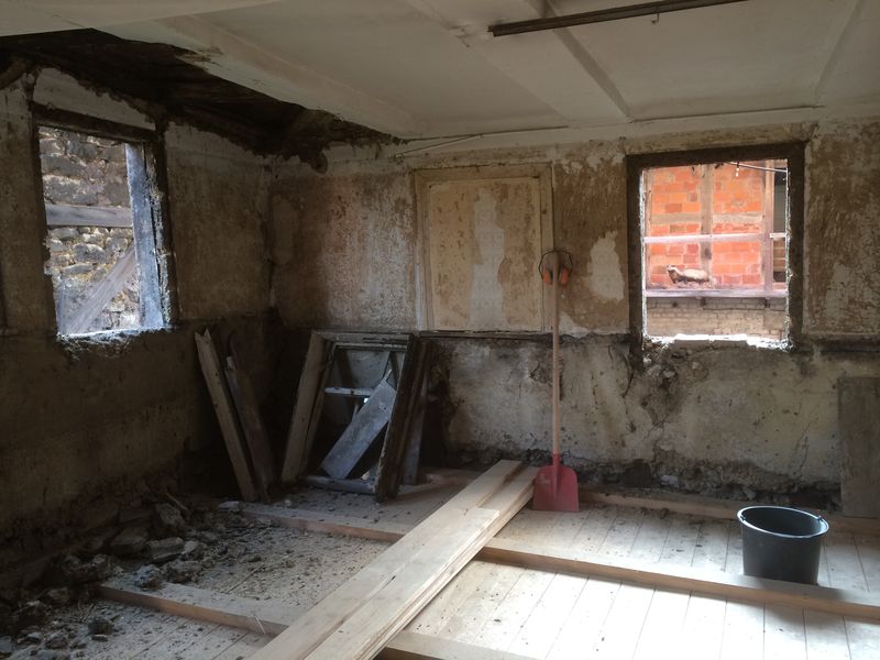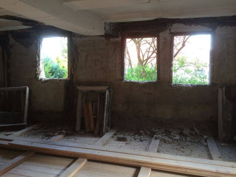 Auf dem unteren Bild erkennt man noch einen alten Fensterrahmen. Früher hat dort mal ein Klavier gestanden, hat uns der Vorbesitzer erzählt. Er kommt regelmäßig und schaut, was wir schon wieder geschafft haben. Schließlich ist er auf dem Hof aufgewachsen und kennt jeden Winkel.