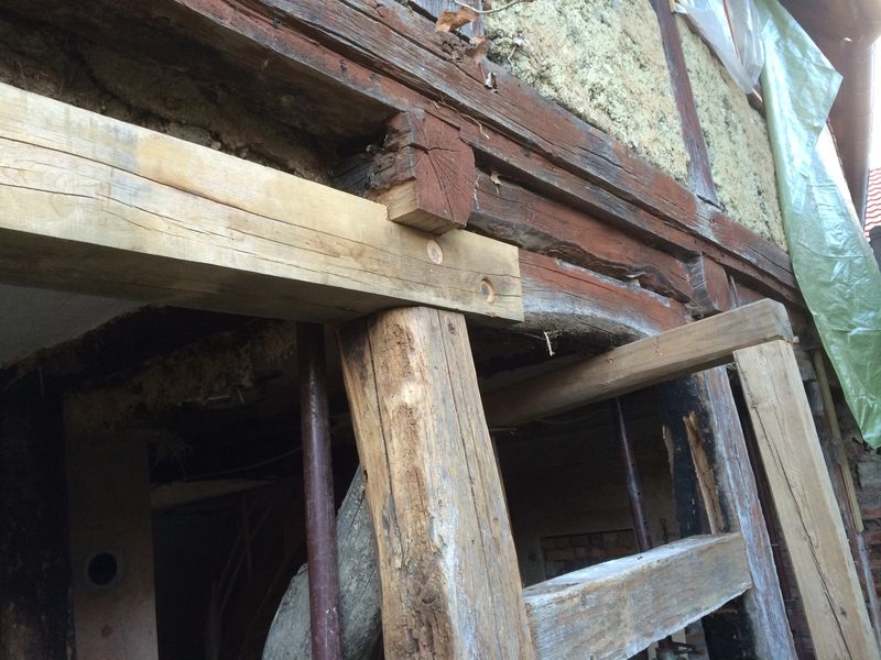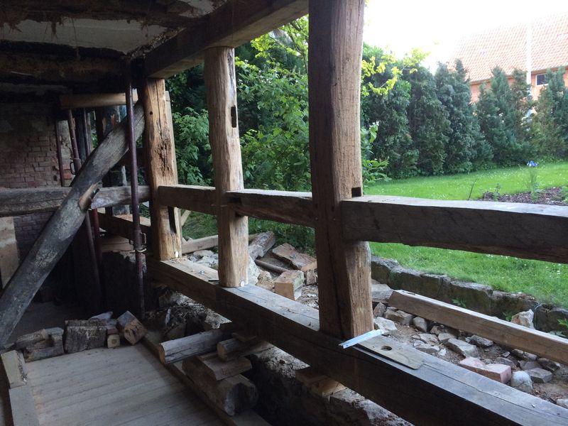 Die Ständer wurden aufgearbeitet und wieder eingesetzt. Der Rähm wurde teilweise erneuert.