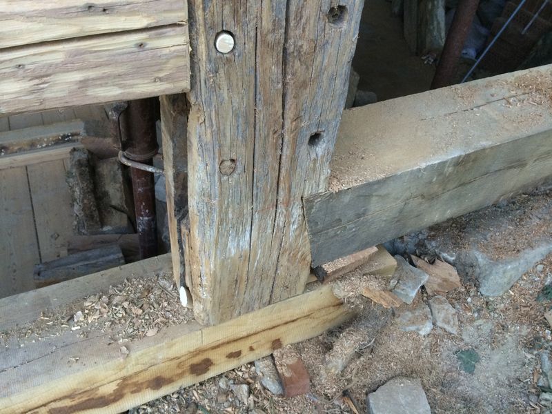 Und dann wieder ein Überraschungsei: die beiden Deckenbalken und die Obergeschoss-Schwelle waren durch. Die Ecke hatte doch mehr gelitten, als anfangs vermutet.