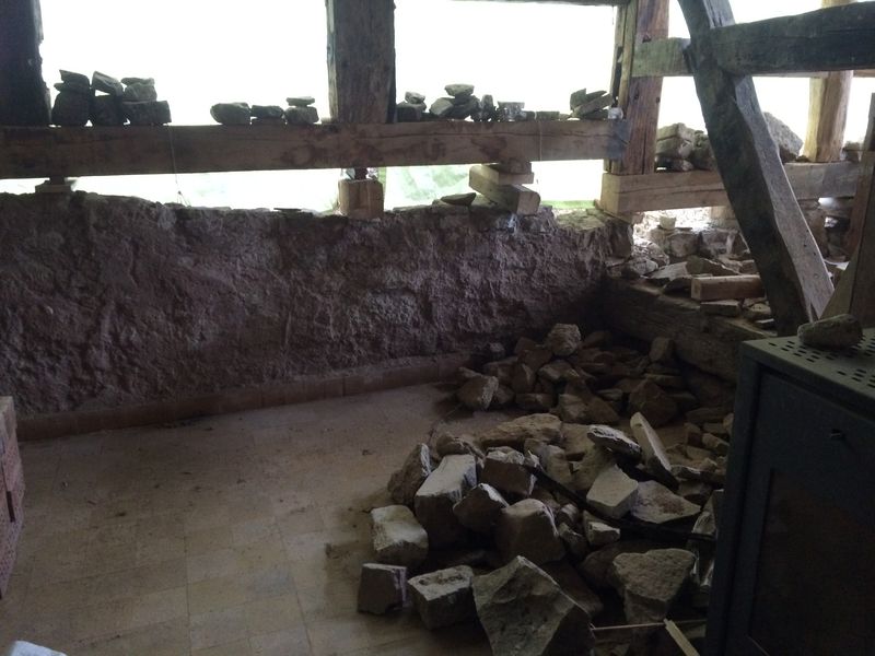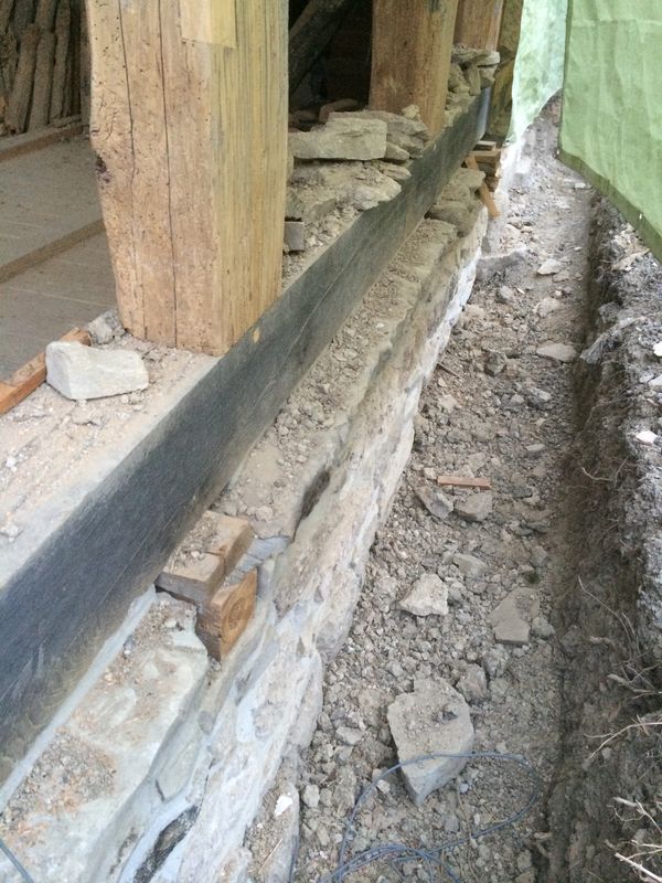 Während sich also die Zimmerleute dem Giebel widmen, sind wir dabei, die Schwelle der Traufseite zu untermauern. Damit diese nicht auch noch ewig ein Schwebebalken bleibt... Wie gut,dass ich einen schönen Steinhaufen im Keller hatte!