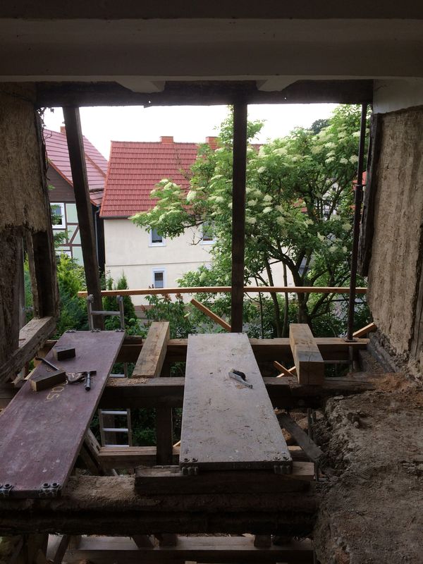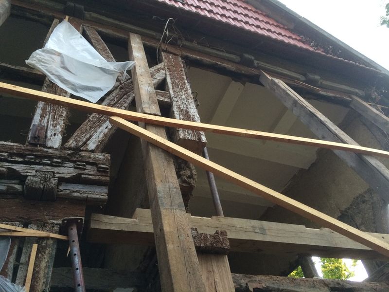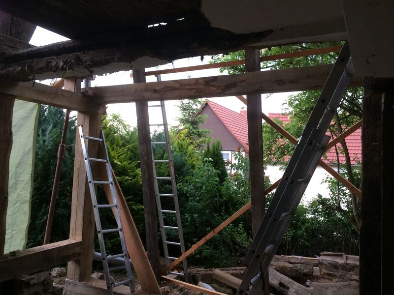Die ganze rechte Giebelwand war kurzzeitig wech... zum Glück war ich nicht vor Ort. Sonst wäre ich sicher wie ein Puma auf und ab gewandert. Doch die Zimmermänner wußten sicher, was sie tun.