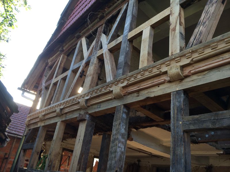 Ich habe sogar mein Zahnfries und die Verzierungen in der Obergeschossschwelle wieder orginalgetreu in Handarbeit geschnitzt bekommen. Es war eine Freude, dem Künstler bei seiner Arbeit zuzusehen... Nen Stück Liebe hat er dabei garantiert mit rein gestreckt.