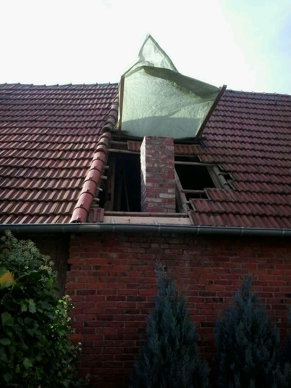 Zum Schutz vor Regen diente uns eine Plane, die auf dem Bild noch zu sehen ist. Anschließend wurde das Dach wieder eingedeckt und traditionell der Schornsteinanschluss mit Mörtel abgedichtet.