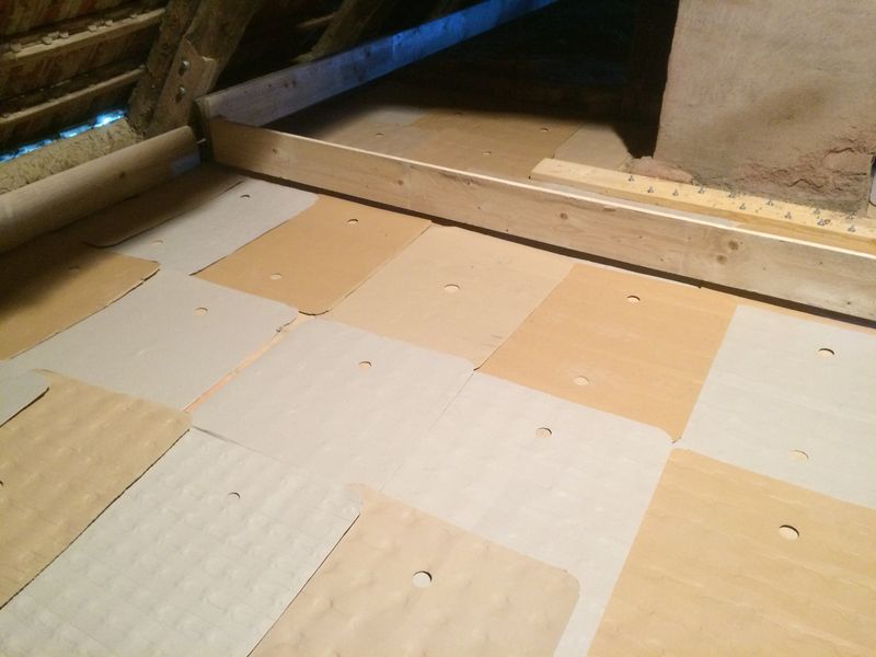 Beim Verlegen habe ich darauf geachtet, dass die Löcher nicht auf einer Ritze liegen. Nun kann ich ruhigen Gewissens den Lehm einbringen...