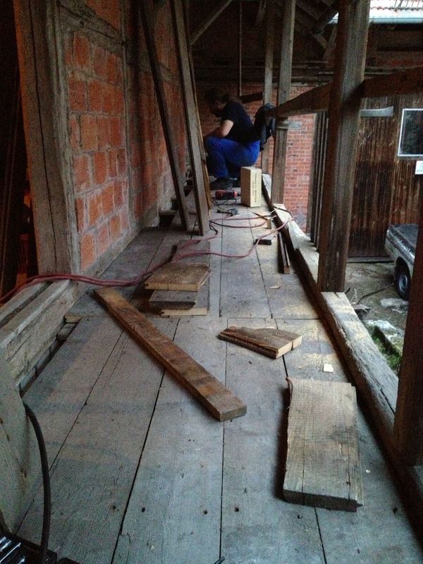 Also die losen Hölzer runter, die Stahlträger imprägnieren und die gebrauchten neuen Bretter drauf...