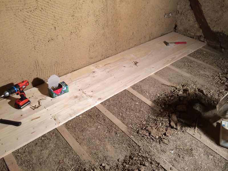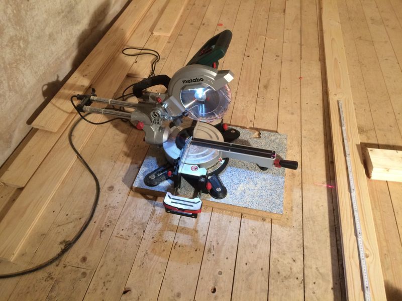 Und weil ich mich beim Schlafzimmer mit der Handkreissäge so gequält habe, kam der Beschluss, mir eine vernünftige Kappsäge zu kaufen. Damit kann ich nämlich auch alleine und genauer arbeiten. Die Lehmschüttung habe ich abgezogen und dann die ersten Bretter verlegt.